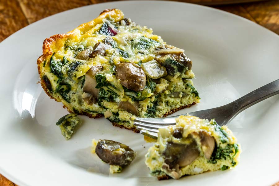 Wunderbar saftige Champignon Spinat Frittata. Angebratene Pilze und frischer Blattspinat verschmolzen mit einer aromatischen Käse-Ei Hülle.