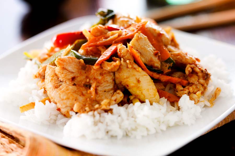 Die Kombination aus Hähnchenbrust und Basmatireis verfeinert mit Paprika und Tomaten ist ein perfektes kalorienarmes und proteinreiches Gericht.