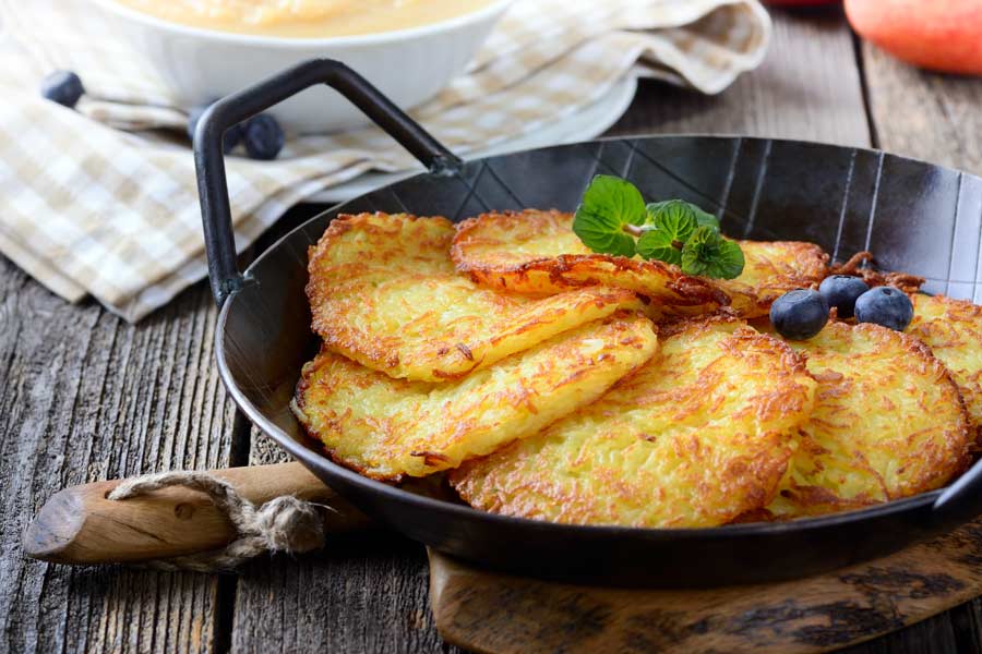 - Die Kartoffelpuffer bei mittlerer Hitze braten, bis die Unterseite goldbraun ist und sich ein brauner Rand an der Oberseite zeigt. Die Kartoffelpuffer wenden und goldbraun fertig braten.