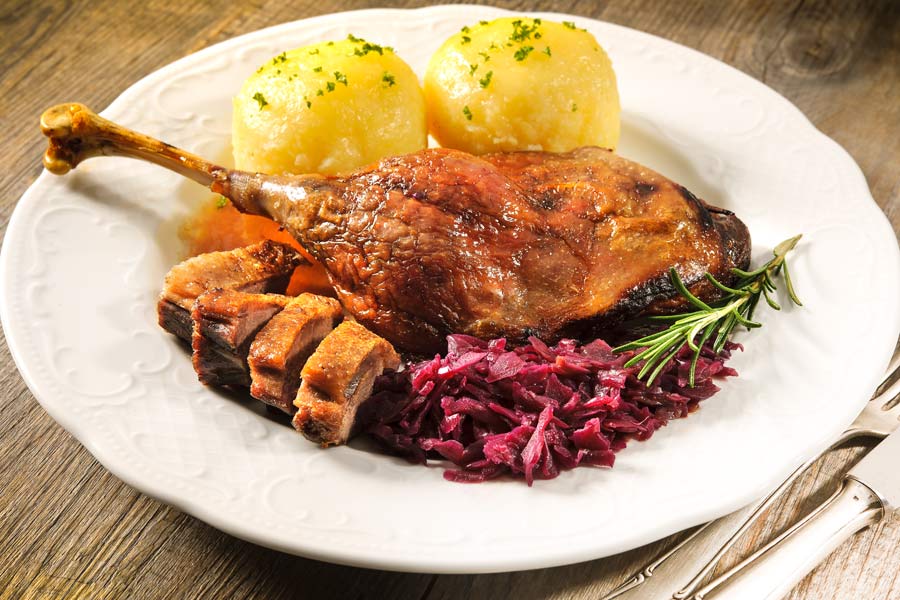 Knusprige Gänsekeule mit Apfelrotkohl und Klößen