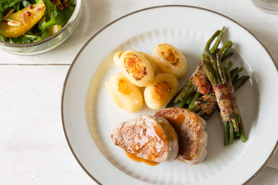 Schweinemedaillons mit Bohnen im Speckmantel und Backkartoffeln