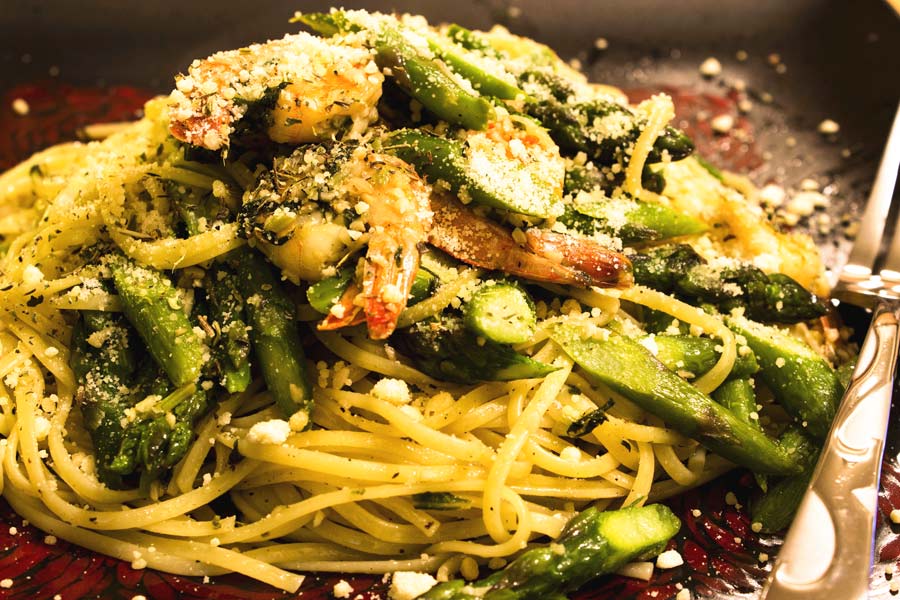 Pasta mit einem feinen grünen Spargel, zarten Garnelen und einer sahnigen Wein-Sauce.